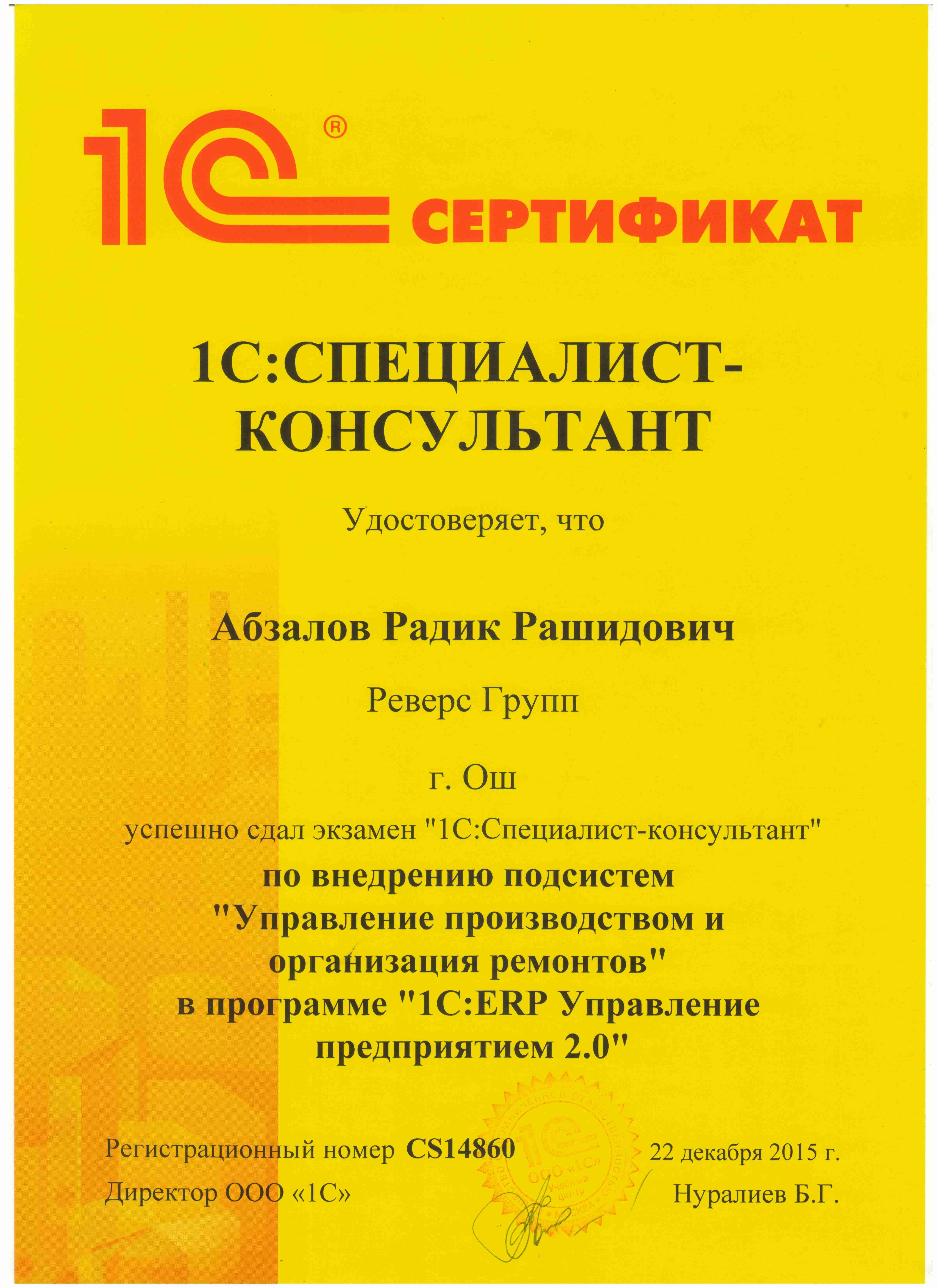 Сертификат 1С:Специалист. По управлению производством и ремонтами в ERP 2